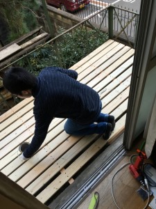 昼間は、長年風雨にさらされてすっかり朽ち果ててしまっていた我が家のベランダもとい物干しスペースの床板の貼り替えを行いました。