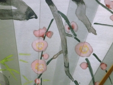 写真1枚目が金色地に白梅の描かれている面で、写真2枚目が銀色地に梅の描かれている面です。