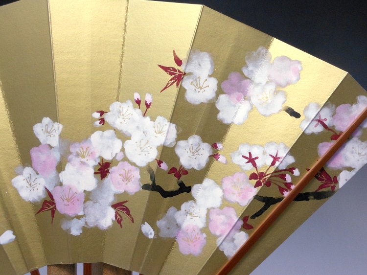 表面は金色地に桜、裏面は白地に舞い散る桜の花びらが描かれている飾り扇子(カワホリ)です。