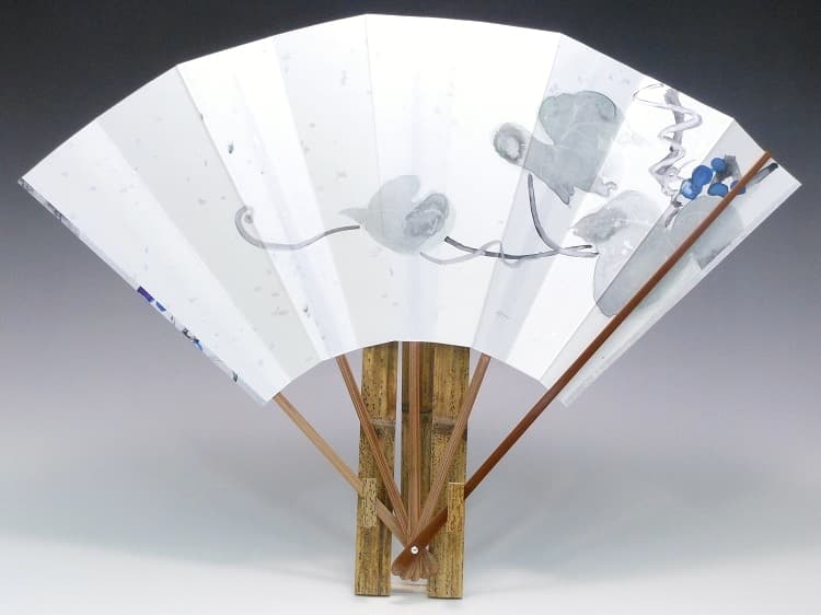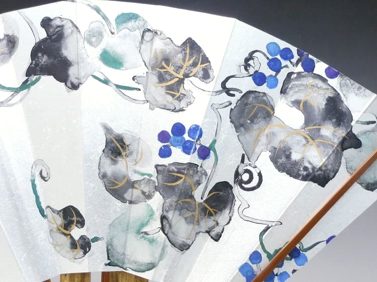 銀モミ地に手描きによる山葡萄(ヤマブドウ)の図柄の飾り扇子(カワホリ)です。骨は焼煤竹の5本骨です。