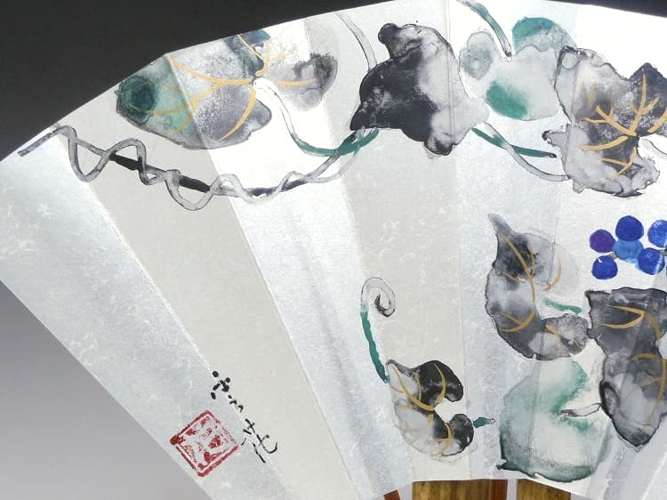 日本画家・河野眞治氏による肉筆の作品となっています。本金や本銀、厳選された天然の岩絵の具で描かれており素晴らしい発色の贅沢な飾り扇子です。